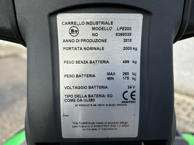 Deze BT elektrische pallettruck uit 2015 heeft een capaciteit van 2000 kg. De truck is voorzien 1150 mm vorken met 550 mm breedte over de vorken en enkele vorkrollen. Verder is de machine voorzien van een opklapbaar meerijdplateau, beschermbeugels en stuurbekrachtiging.