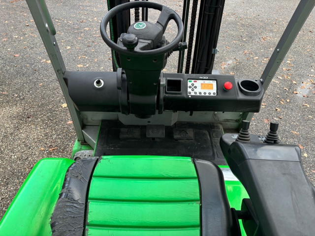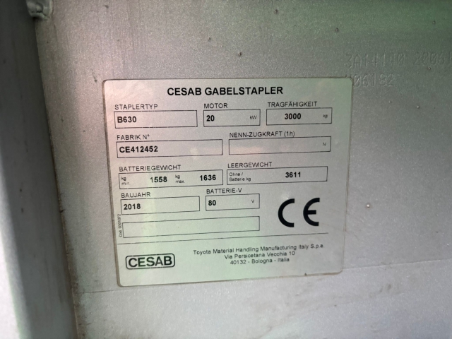 Deze Cesab elektrische vorkheftruck uit 2018 heeft een capaciteit van 3000 kg. De truck is uitgevoerd met een tweedelige hefmast met 3300 mm hefhoogte en 2350 mm doorrijhoogte.