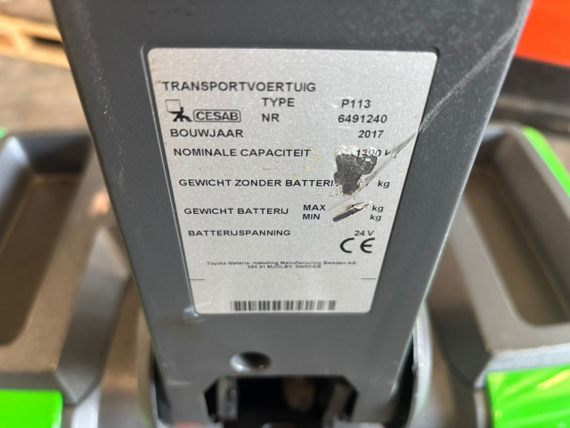 Deze elektrische pallettruck uit 2017 heeft een capaciteit van 1300 kg. De truck is uitgevoerd met 1150 mm vorken en een ingebouwde lader.