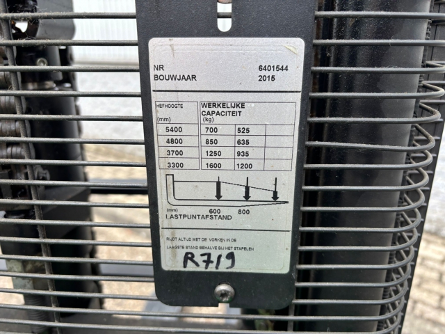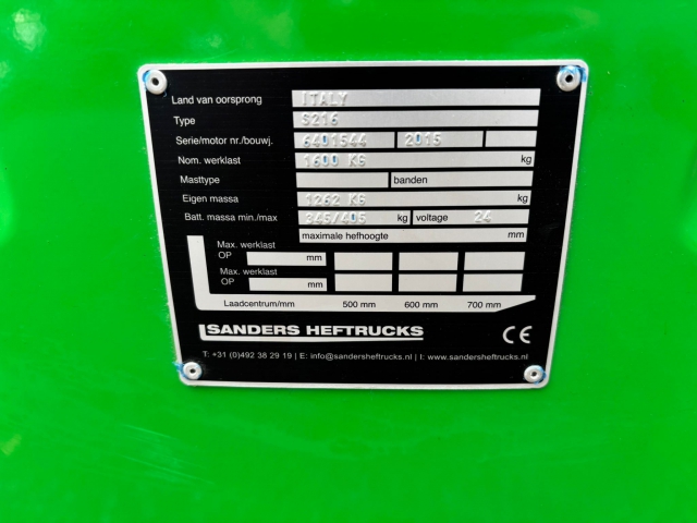 Deze Cesab elektrische stapelaar uit 2015 heeft een capaciteit van 1600 kg. De truck is uitgevoerd met een driedelige hefmast met 5400 mm hefhoogte en 2370 mm doorrijhoogte. De vorken zijn 1150 mm lang en de breedte over de vorken is 570 mm.