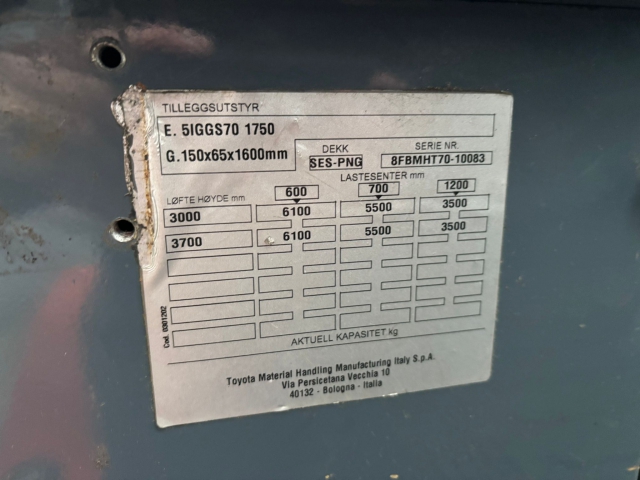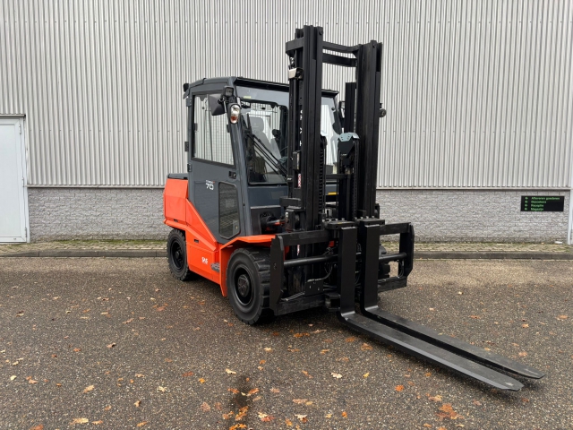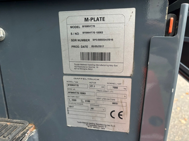Deze Toyota elektrische vorkheftruck uit 2017 heeft een capaciteit van 7000 kg. De truck is uitgevoerd met een tweedelige hefmast met 3700 mm hefhoogte en 2780 mm doorrijhoogte. Verder is de truck uitgevoerd met side-shift, volledige cabine met verwarming en airco, werklampen, vorkversteller en een voor en achteruitrij camera.