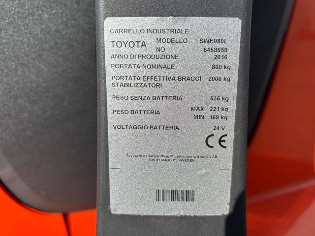 Deze Toyota stapelaar uit 2016 heeft een capaciteit van 2000/ 800 kg. De truck is uitgevoerd met een enkele mast en 1580 mm hefhoogte. De vorken zijn 1200 mm lengte.